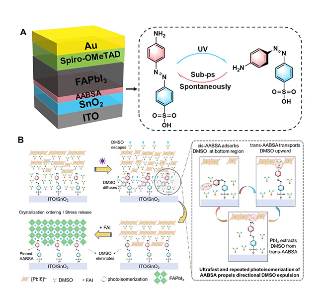 团队通过原位紫外光照UV-vis光谱和超快瞬态吸收光谱分析,证实了AABSA分子具有超快光异构能力。进一步通过液体核磁共振(NMR)等实验,揭示了AABSA与DMSO之间存在显著相互作用。理论计算表明,顺式AABSA与DMSO的结合能高于反式构型,但仍低于PbI₂与DMSO的结合能。这一结合能梯度差异引导顺式AABSA优先捕获DMSO分子,随后回复为反式构象,将DMSO向上输送;最终DMSO被上层PbI₂捕获,而反式AABSA恢复为顺式构型,完成单次输送循环。在持续紫外光照射下,AABSA发生高速、可逆的顺反异构,驱动DMSO从埋底界面定向、连续向外迁移,直至其被完全清除。